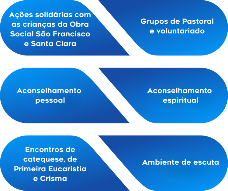 Ser uma Escola em Pastoral significa agir sob o prisma do carisma de São Francisco de Assis, dentro e fora da sala de aula. São realizadas diversas orientações com as crianças e jovens que vão de encontro ao resgate da pessoa humana, da descoberta de cada um como filho de Deus e instrumento de transformação da realidade de injustiça para uma realidade onde haja vida em abundância (cf. Jo 10, 10).